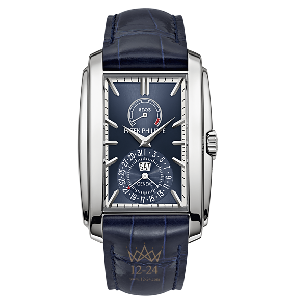 Часы Gondolo воплощают стремление великой мануфактуры Patek Philippe возвратиться к историческим истокам и создавать гениально минималистичные, изящные модели, подкупающие именно сдержанностью, а не усложнениями. Для этой новой модели был специально разработан механизм 28-20 REC 8J PS IRM C J с ручным заводом и двумя заводными барабанами, которые обеспечивают 192 часа энергии. В положении "6 часов" расположился совмещенный индикатор секунд, даты и дня недели. Его уравновешивает сверху индикатор запаса хода. На синем циферблате расположились также накладные часовые метки из золота и стрелки "дофин". Часы выпущены в корпусе из белого золота на ремешке из кожи аллигатора.