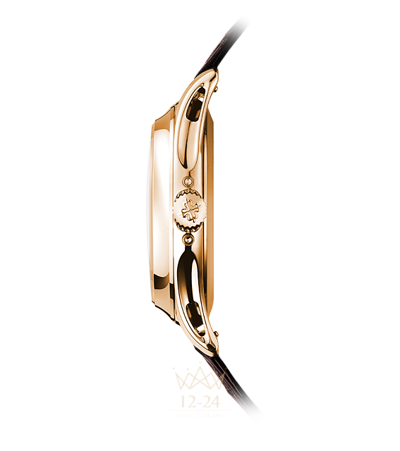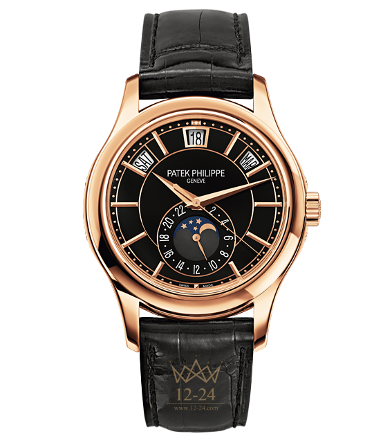 Классические часы в деловом стиле с модулем годового календаря и фазами Луны. На черном лакированном циферблате, не перегружая его и оставляя прекрасную читаемость показаний, в виде полукруга размещены апертуры месяца, даты и дня недели. Они настолько удачно "встроены" в часовую разметку на внешнем диаметре циферблата, что не мешают считывать основное время часов и минут. Снизу их уравновешивает индикатор фаз Луны, совмещенный с 24-часовым указателем. Часы оснащены механизмом с автоподзаводом. 40-миллиметровый корпус выполнен из розового золота и закреплен на ремешке из кожи аллигатора.