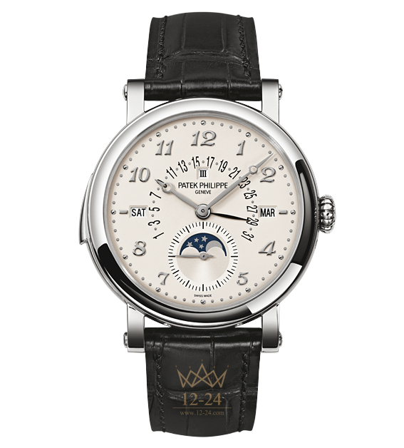 В 2012 году Patek Philippe представил новую модель из серии Grand Complications - как всегда - в духе безупречной элегантности, сдержанной классики и с богатым набором усложнений. Как истинный «джентльмен», этот «мастер усложнений» облачен в корпус из белого золота,дополненный черным кожаным ремешком. На белом циферблате расположились накладные арабские цифры и стрелки с стиле "яблоко Бреге".