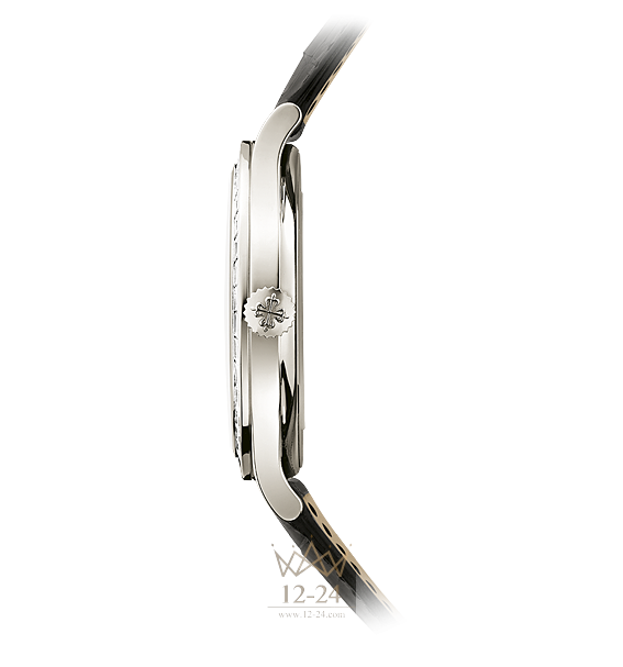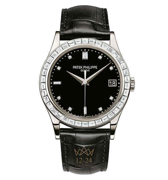 Данная мужская модель выполнена из королевского металла - платины, а безель инкрустирован 38 багетными бриллиантами. Камни располагаются также на застежке и на циферблате, где они играют роль часовых индексов. На позиции "3 часа" установлена апертура даты. Часы выпущены на базе автоматического калибра Patek Philippe 324 S C.
