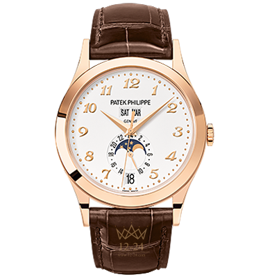Астрономические часы Patek Philippe Complications 5396R-012 выпущены в круглом корпусе из розового золота 18к. Размер составляет 38, 5 мм, водонепроницаемость до 30 м и годовым календарем. Внутри корпуса установлен автоматический механизм, Калибр Patek Philippe 324 S QA LU 24H/303, обеспечивающий запас хода 45 часов. На серебристом циферблате отображаются часы, минуты, секунды, дата, день недели, месяц, фаза луны, 24-х часовой указатель. Часы комплектуются ремешком из кожи аллигатора с золотой вставкой.