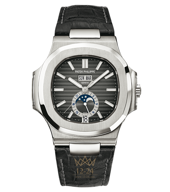 Данная модель выполнена из нержавеющей стали и отличается наличием фирменного годового календаря Patek Philippe. День недели и месяц отображаются в сдвоенной апертуре у отметки "12 часов". В нижней части циферблата установлен индикатор фаз Луны, совмещенный с 24-часовым индикатором, на позицию "6 часов" вынесен календарь даты. Циферблат выполнен в выразительном черном цвете.