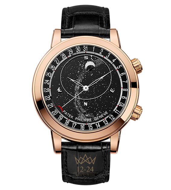 Для изображения небесного купола компания Patek Philippe разработала систему из трех накладывающихся друга на друга сапфировых дисков, вращающихся с разными скоростями. Это прозрачный диск с изображением млечного пути, черный диск с апертурой определяющий орбиту луны и маленький диск фазы луны. Ночное небо над Северным полушарием неспешно вращается по кругу, показывая движение звезд и момент прохождения Сириуса и Луны через меридиан. Две скелетированные стрелки в центре указывают среднее солнечное время. Как и предыдущая модель из платины с синим циферблатом 2012 года, новинка успешно интегрировала функцию даты – текущее число указывает центральная стрелка с красным наконечником в виде серпа.