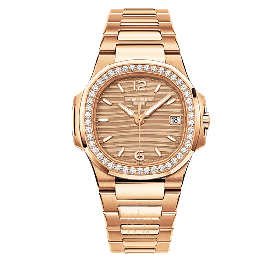 Выполненная в характерном стиле часов коллекции Nautilus с их корпусом в виде иллюминатора подводной лодки, эта женская модель выделяется благодаря красивой отделке: на золотистом гильошированном циферблате расположились накладные часовые индексы из золота. Рант декорирован 46-ю белыми бриллиантами, браслет выполнен из розового золота. Посреди этого великолепия расположились центральные стрелки часов и минут с люминесцентным покрытием, а также апертура с датой в позиции «3 часа». Часы выпущены на базе кварцевого калибра E 23 S C.