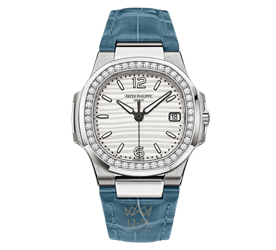 Выполненная в характерном стиле часов коллекции Nautilus с их корпусом в виде иллюминатора подводной лодки, эта женская модель выделяется благодаря красивой отделке: на белом гильошированном циферблате расположились накладные часовые индексы из золота. Рант декорирован 46-ю белыми бриллиантами, браслет выполнен из кожи аллигатора. Посреди этого великолепия расположились центральные стрелки часов и минут с люминесцентным покрытием, а также апертура с датой в позиции «3 часа». Часы выпущены на базе кварцевого калибра E 23 S C.