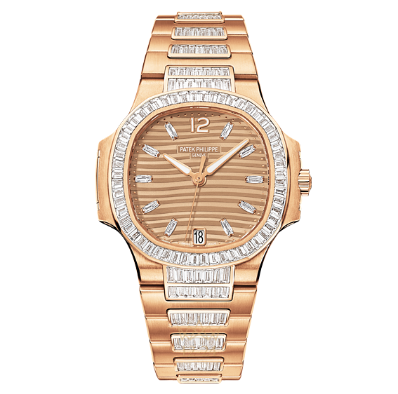 Выполненная в характерном стиле часов коллекции Nautilus с их корпусом в виде иллюминатора подводной лодки, эта женская модель поражает роскошью отделки: на золотом гильошированном циферблате расположились 10 багетных бриллиантов в роли часовых индексов. Рант декорирован 56-ю белыми бриллиантами, браслет из розового золота, инкрустирован 146-ю белыми багетными бриллиантами весом 8.76 карата. Посреди этого великолепия расположились центральные стрелки часов и минут с люминесцентным покрытием, а также апертура с датой в позиции «6 часов». Часы выпущены на базе автоматического калибра 324 S C.