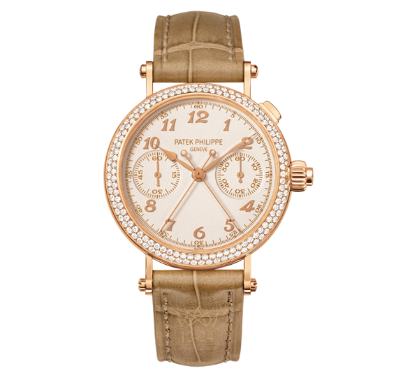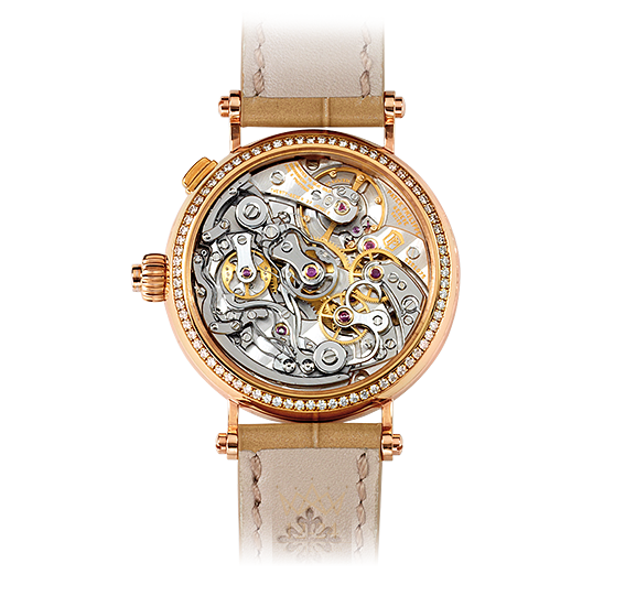 Удивительно, что столь сложный механизм был помещен в небольшой 33-миллиметровый корпус из розового золота. Дань уважения прекрасным дамам - 153 белых бриллианта на безеле весом 0,72 карата и 26 бриллиантов на золотой застежке. Полностью в духе Patek Philippe, "теплое" сочетание розового золота и кремового циферблата дополнено бежевым ремешком из кожи аллигатора.
