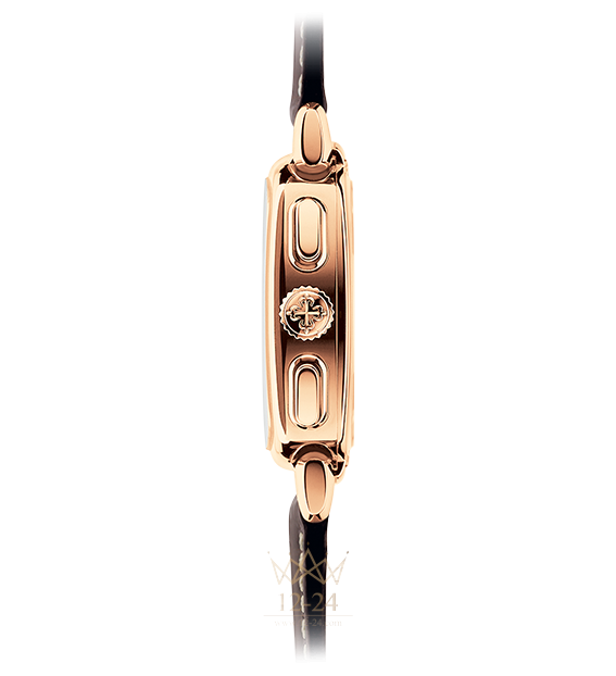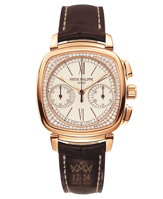 Корпус в форме подушки с изящно скругленными углами имеет довольно внушительные для женского запястья размеры: 39 мм в длину, 35 мм в ширину и 10,95 толщиной. Несмотря на то, что корпус из розового золота тяготеет к форме квадрата, циферблат часов круглый, более того, он украшен выразительной рамкой из бриллиантов. На графичном белом циферблате счетчики хронографа изображены в виде кругов, вписанных в овалы. Все в этих часах пронизано эстетикой ар-деко и стилизовано под модели часов Patek Philippe 20-30-х годов. Модель комплектуется коричневым ремешком из кожи аллигатора.