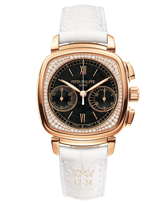 Корпус в форме подушки с изящно скругленными углами имеет довольно внушительные для женского запястья размеры: 39 мм в длину, 35 мм в ширину и 10,95 толщиной. Несмотря на то, что корпус из розового золота тяготеет к форме квадрата, циферблат часов круглый, более того, он украшен выразительной рамкой из бриллиантов. На черном гильошированном циферблате счетчики хронографа изображены в виде кругов, вписанных в овалы. Все в этих часах пронизано эстетикой ар-деко и стилизовано под модели часов Patek Philippe 20-30-х годов. Модель комплектуется белоснежным ремешком из кожи аллигатора.