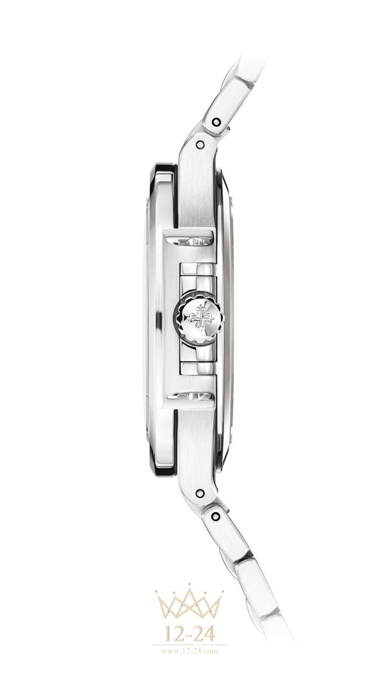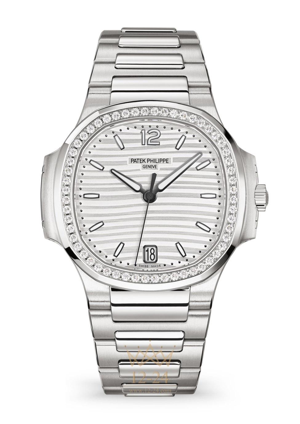 Автоматические женские часы Nautilus из стали с украшенным бриллиантами безелем (7118/1200A-010) теперь предлагаются в еще более выразительном исполнении: диаметр корпуса был увеличен с 33,6 мм до 35,2 мм. Преображения затронули и цветовую гамму циферблата, который пополнился серебристым опаловым оттенком к внешнему краю, плавно переходящими в черный цвет.