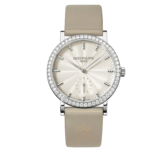 Это классическая модель механических часов с боковой секундной стрелкой в женской коллекции Calatrava. Часы представлены в миниатюрном по современным меркам 31-миллиметровом корпусе из белого золота. Рант декорирован 54-мя бриллиантами весом 0,7 карата. Циферблат украшен узором гильоше, переливающимся в лучах света, по внешнему диаметру идет разметка с золотыми часовыми индексами. Модель крепится на атласном ремешке.