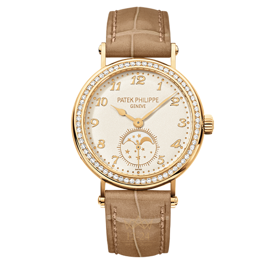 Новые часы для женщин с индикатором фаз Луны от Patek Philippe. Выполненные в нежных пастельных тонах, эти часы обладают особым обаянием и притягательностью. Корпус, изготовленный из желтого золота, декорирован 66-ю бриллиантами, расположившимися на ранте. На кремовом циферблате разместились изящные стрелки часов и минут, а также накладные индексы из золота. В положении "6 часов" находится индикатор фаз Луны. Образ завершается бежевым ремешком из кожи аллигатора. Сердцем хронометра стал калибр 215 PS LU с ручным заводом.