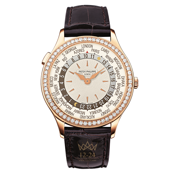 Во время практически любой заграничной поездки путешественникам приходится переводить свои часы как минимум дважды. Но эта операция может стать настоящим удовольствием с этими часами от Patek Philippe, которые предназначаются прекрасным дамам. Индикация мирового времени представляет собой два вращающихся кольца, на которые нанесены все 24 часовые зоны. Одно нажатие на кнопку – и текущий часовой пояс окажется в мгновение ока у позиции «12 часов». Дизайн модели навеян 1930-ми годами, поэтому часы в мягкой, приглушенной цветовой гамме имеют приятный оттенок винтажности. По гильошированному вручную циферблату ходят миниатюрные стрелки часов и минут из золота. Рант декорирован 62 бриллиантами, и еще 27 камней разместились на золотой застежке ремешка. А небольшой 36-миллиметровый корпус из розового золота, заключающий в себе автоматический механизм, говорит о том, что эти часы – произведение искусства и предназначены не совсем для обычных путешественниц.