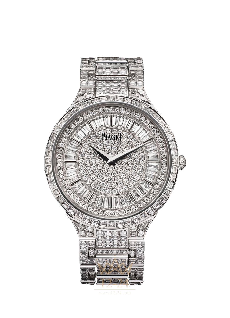 Часы Dancer, 41 мм. Корпус из белого золота 18 карат с 36 бриллиантами багетной огранки (около 1,8 карата), 16 бриллиантами изумрудной огранки (около 0,9 карата) и 144 бриллиантами классической огранки (около 1,14 карата). Циферблат из белого золота 18 карат с 36 бриллиантами багетной огранки (около 3,6 карата) и 162 бриллиантами классической огранки (около 2,47 карата), часовые индексы из белого золота 18 карат. Заводная головка из белого золота 18 карат с 14 бриллиантами классической огранки (около 0,17 карата). Браслет из белого золота 18 карат с 60 бриллиантами изумрудной огранки (около 3 карат) и 9 бриллиантами классической огранки (около 0,02 карата). Задняя крышка из сапфирового стекла. Ультратонкий мануфактурный механизм Piaget 830P с ручным заводом.