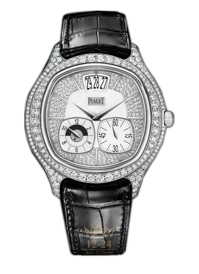 Часы Piaget Emperador с корпусом в форме «подушечка», 42 мм. Корпус из белого золота 18 карат со 136 бриллиантами круглой огранки (около 2,6 карата). Циферблат из белого золота 18 карат со 164 бриллиантами круглой огранки (около 0,4 карата), с часовыми индексами из белого золота 18 карат и центральным секторо