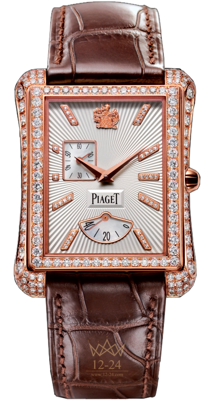Часы Piaget Emperador, 32 х 41 мм. Корпус из розового золота 18 карат со 171 бриллиантом круглой огранки (около 2,1 карата). Циферблат из белого перламутра с часовыми индексами из розового золота 18 карат, с 34 бриллиантами круглой огранки (около 0,1 карата) и гербом Piaget из розового золота 18 карат. Мануфактурный механизм Piaget 551P с автоматическим подзаводом, малой секундной стрелкой и указателем запаса хода