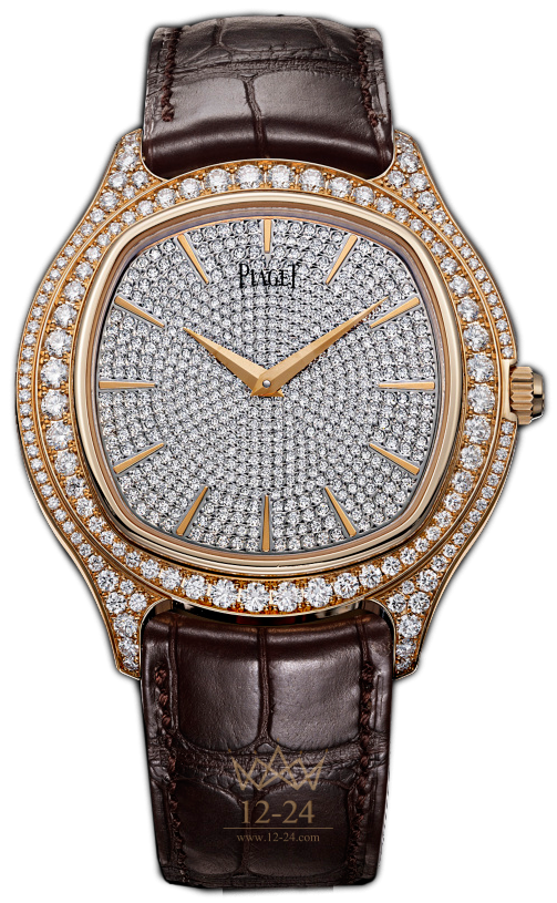 Часы Piaget Emperador с корпусом в форме «подушечка», 42 мм. Корпус из розового золота 18 карат со 136 бриллиантами круглой огранки (около 2,6 карата). Циферблат из белого золота 18 карат с 536 бриллиантами круглой огранки (около 1,6 карата), часовые индексы из розового золота 18 карат. Задняя крышка из сапфирового стекла. Мануфактурный механизм Piaget 809P с автоматическим подзаводом. Ротор из розового золота 18 карат.