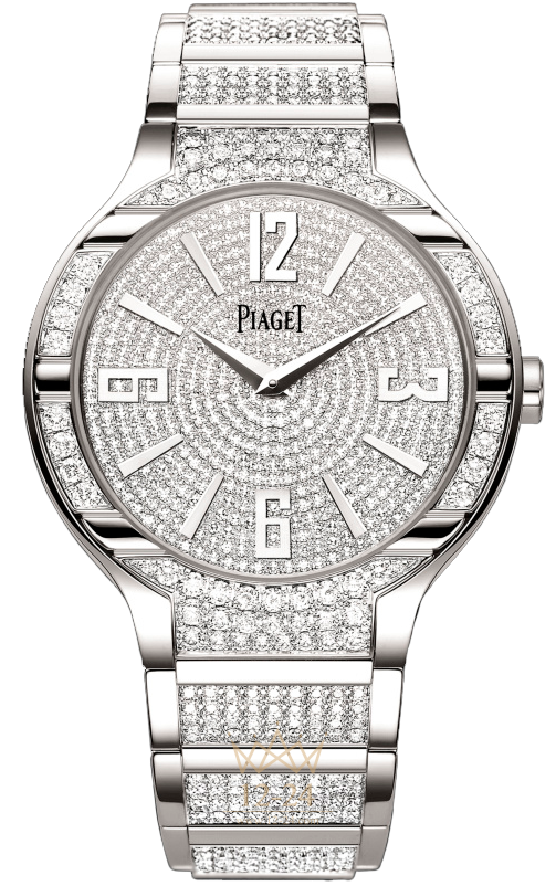 Часы Piaget Polo, 40 мм. Корпус из белого золота 18 карат с 68 бриллиантами круглой огранки (около 1,9 карата). Циферблат с 490 бриллиантами круглой огранки (около 2 карат). Браслет из белого золота 18 карат с 576 бриллиантами круглой огранки (около 5,9 карата). Мануфактурный механизм Piaget 534P с автоматическим подзаводом.