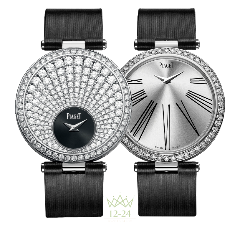 Часы Limelight Twice, 35 мм. Корпус из белого золота 18 карат с 278 бриллиантами круглой огранки (около 5,3 карата). Двусторонняя застежка с 54 бриллиантами круглой огранки (около 0,2 карата). Двусторонний ремешок. Два кварцевых механизма Piaget 56P.