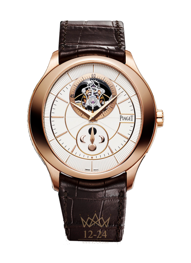 Часы Piaget Gouverneur, 43 мм. Корпус из розового золота 18 карат. Посеребренный циферблат с гильошированным узором в виде солнечных лучей и золотыми ободками, часовые индексы и изображения Луны из розового золота 18 карат. Маленькая задняя крышка из сапфирового стекла. Ультратонкий мануфактурный механизм Piaget 642P с ручным заводом, турбийоном и астрономическим указателем фаз Луны в положении «6 часов».