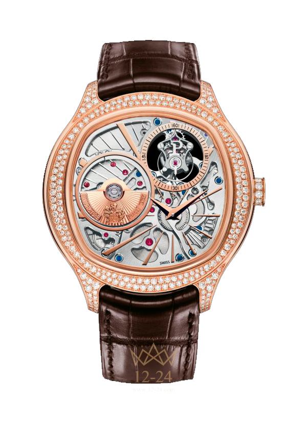 Часы Piaget Emperador с турбийоном, 46,5 мм. Корпус из розового золота 18 карат с 228 бриллиантами круглой огранки (около 1,8 карата). Заводная головка с 10 бриллиантами круглой огранки (около 0,2 карата). Миниатюрная задняя крышка из сапфирового стекла. Ультратонкий мануфактурный механизм Piaget 1270P с турбийоном, автоматическим подзаводом, указателем запаса хода на обратной стороне корпуса и ротором из платины. Пронумерованная серия.