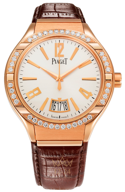 Часы Piaget Polo, 43 мм. Корпус из розового золота 18 карат с 42 бриллиантами круглой огранки (около 1 карата). Циферблат с часовыми индексами из розового золота 18 карат. Мануфактурный механизм Piaget 800P с автоматическим заводом, секундной стрелкой и указателем даты.