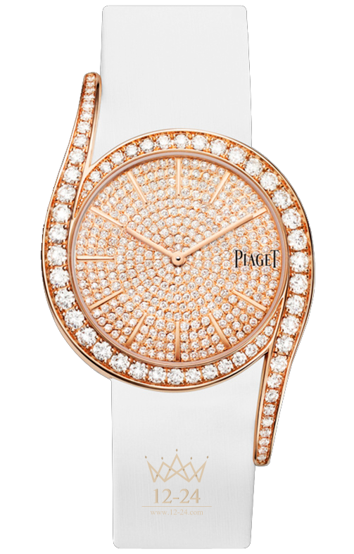 Часы Limelight Gala, 38 мм. Корпус из розового золота 18 карат с 62 бриллиантами круглой огранки (около 2,8 карата). Циферблат с 336 бриллиантами круглой огранки (около 1,7 карата). Застежка с 15 бриллиантами круглой огранки (около 0,1 карата). Кварцевый механизм Piaget 690P.