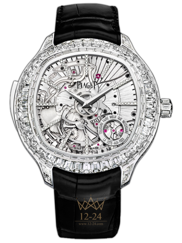 Часы Piaget Emperador с корпусом в форме «подушка», 49 мм. Корпус из белого золота 18 карат с 44 бриллиантами изумрудной огранки (около 7,2 карата), 92 бриллиантами багетной огранки (около 3 карат) и 314 бриллиантами круглой огранки (около 1,3 карата). Циферблат с 72 бриллиантами круглой огранки (около 0,2 карата). Заводная головка с 8 бриллиантами багетной огранки (около 0,2 карата) и одним бриллиантом круглой огранки (около 0,3 карата). Застежка с 24 бриллиантами багетной огранки (около 1,7 карата). Задняя крышка из сапфирового стекла. Мануфактурный механизм Piaget 1290P, самый тонкий по форме в мире механизм с автоматическим заводом и минутным репетиром (толщина 4,8 мм). Ротор из платины. Пронумерованная серия.