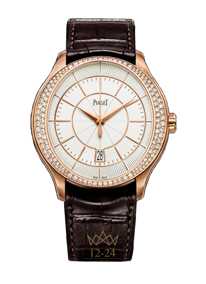 Часы Piaget Gouverneur, 43 мм. Корпус из розового золота 18 карат со 128 бриллиантами круглой огранки (около 1,4 карата). Циферблат с гильошированным узором в виде солнечных лучей, часовые индексы и указатель даты из розового золота 18 карат. Задняя крышка из сапфирового стекла. Мануфактурный механизм Piaget 800P с автоматическим подзаводом, секундной стрелкой и указателем даты.
