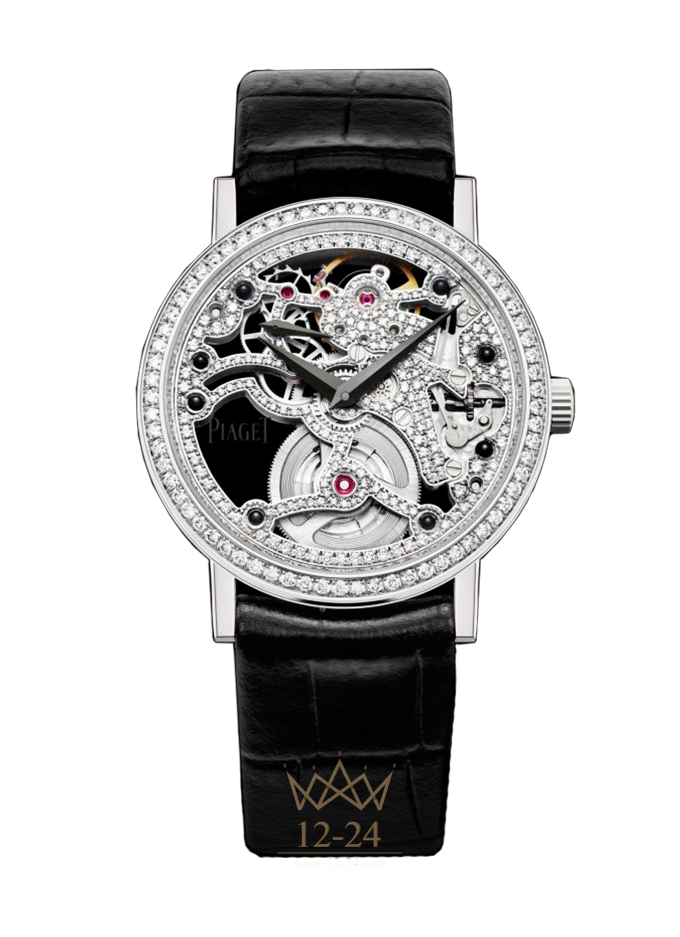 Часы Piaget Altiplano, модель «скелетон», 34 мм. Корпус из белого золота 18 карат с 69 бриллиантами круглой огранки (около 0,6 карата). Застежка с 23 бриллиантами круглой огранки (около 0,04 карата). Задняя крышка из сапфирового стекла. Ультратонкий мануфактурный механизм «скелетон» Piaget 838D с ручным заводом. Платина механизма из белого золота. Малая секундная стрелка. Механизм украшен 219 бриллиантами круглой огранки (около 0,6 карата) и 8 черными сапфирами огранки «кабошон» (около 0,2 карата).