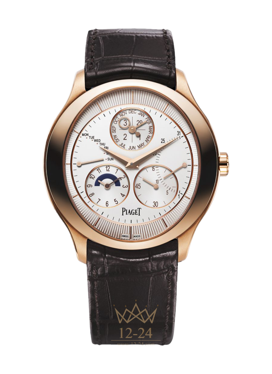 Часы Gouverneur Quantième Perpétuel со сложной архитектурной конструкцией – превосходный образец идеальной гармонии формы и технических достижений Piaget. Эти оригинальные и изысканные роскошные часы из коллекции Black Tie, в форме которых круг гармонично сочетается с овалом, оснащены исключительным механизмом. Сердце часов с вечным календарем – калибр 855P – бьется в корпусе из розового золота, водонепроницаемом до 30 метров. Этот механизм с автоподзаводом обладает большим набором функций: часы, минуты, малая секундная стрелка, второй часовой пояс, индикатор день/ночь, ретроградные указатели дня недели и даты, индикатор месяца и високосного года. Детали сложного механизма с запасом хода до 80 часов отделаны вручную согласно канонам Высокого часового искусства: отделка включает круговой узор Côtes de Genève, жемчужное зернение платины, мосты со срезанными углами и вороненые винты.