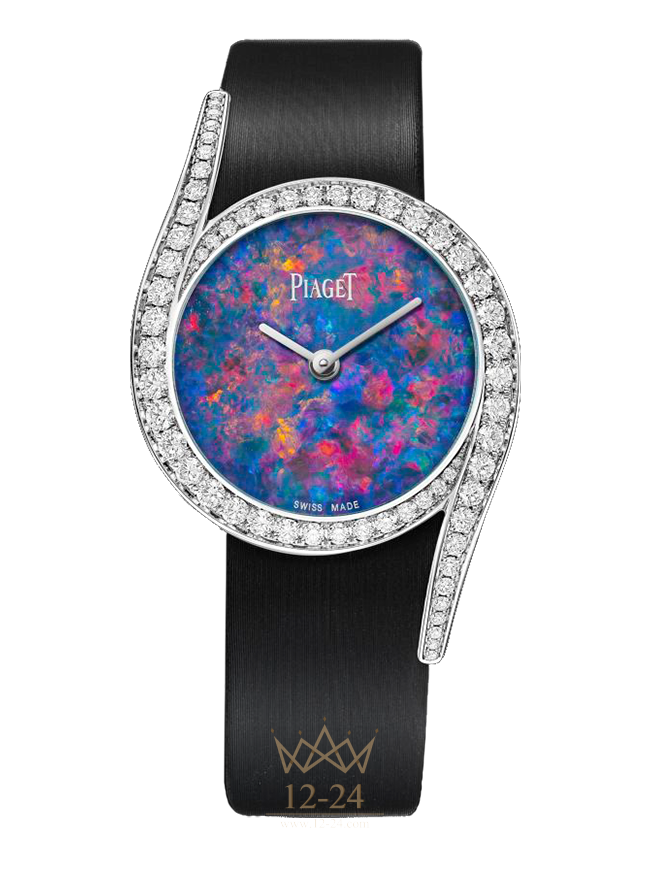 Часы Limelight Gala, 32 мм. Корпус из розового золота 18 карат с 62 бриллиантами круглой огранки (около 1,75 карата). Циферблат из черного опала с красной и синей опалесценцией. Застежка с одним бриллиантом круглой огранки (около 0,01 карата). Кварцевый механизм Piaget 690P. Ограниченная пронумерованная серия из 18 экземпляров.