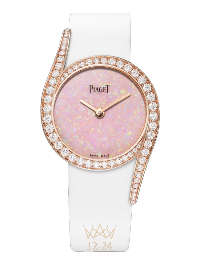 Часы Limelight Gala, 32 мм. Корпус из розового золота 18 карат с 62 бриллиантами круглой огранки (около 1,75 карата). Циферблат из натурального розового опала с золотистой опалесценцией. Застежка с одним бриллиантом круглой огранки (около 0,01 карата). Кварцевый механизм Piaget 690P. Ограниченная пронумерованная серия из 18 экземпляров.