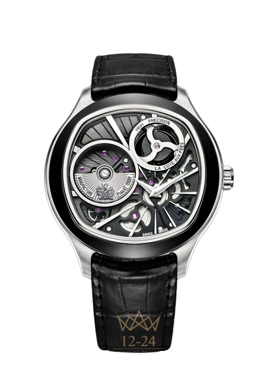 Высокоточные часы с автоподзаводом Piaget Emperador с крупным корпусом в форме «подушка» демонстрируют виртуозное мастерство специалистов Мануфактуры. На протяжении всей своей истории мастера Piaget ставят перед собой две задачи: создание лучших механических часов и стремление к абсолютной точности. Концептуальная модель, выпущенная ограниченной серией из 118 экземпляров, оснащена генератором, который позволил повысить частоту колебаний баланса и добиться максимальной точности механических часов. Калибр в форме «подушка» с классической отделкой черного цвета отличается «перевернутой» конструкцией. Оттенок круглого ободка из золота с ADLC-покрытием перекликается с черным цветом механизма. Эксклюзивный механизм, не имеющий равных в точности, помещен в корпус формы «подушка» из белого золота диаметром 46,5 мм смелого современного дизайна.