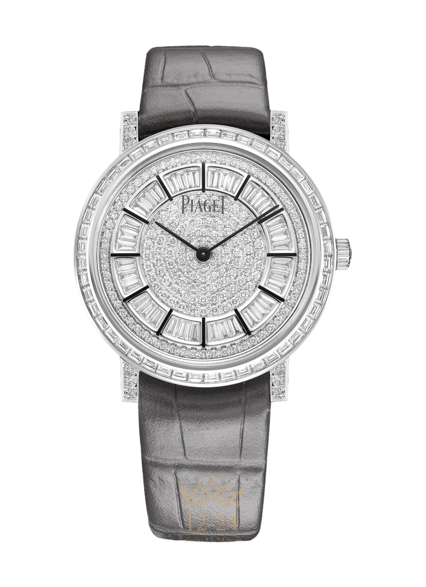 Piaget покоряет новую вершину творчества, создавая исключительно изысканную модель, в сиянии которой ювелирное и часовое мастерство сливаются воедино. Часы категории Высокое ювелирное искусство, украшенные 546 бриллиантами багетной и круглой огранки, таят в себе ультратонкий мануфактурный механизм Piaget 430P с ручным заводом толщиной всего 2,1 мм. Боковые поверхности корпуса из белого золота, ушки и задняя крышка инкрустированы круглыми бриллиантами, а ободок усыпан бриллиантами багетной огранки. Утонченный облик циферблата соответствует эстетическим канонам коллекции Altiplano. Бриллианты багетной огранки очерчивают контуры часовой шкалы с тонкими индексами серого цвета в форме палочек. Ослепительную роскошь этих часов толщиной всего 6,6 мм дополняет ремешок из серой кожи аллигатора с украшенной бриллиантами стандартной застежкой.