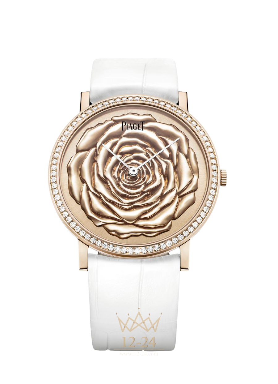 Ультратонкие часы из розового золота, с бриллиантами. Золотой циферблат с гравировкой. Ремешок из кожи аллигатора белого цвета. Благодаря сочетанию редких техник роскошные женские часы Altiplano объединяют легенду часового искусства и королеву цветов – розу, которая всегда восхищала мастеров Дома. Владение секретами изысканных художественно-прикладных ремесел позволило специалистам Piaget воссоздать великолепие розы Ив Пьяже, получившей первый приз на Международном конкурсе новых сортов роз в Женеве в 1982 году. Нежный цветок раскрывает 80 переливающихся лепестков на циферблате из розового золота с искусной гравировкой, продолжая великую традицию творческого созидания швейцарской Мануфактуры. В инкрустированный 78 бриллиантами корпус модели из розового золота диаметром 38 мм установлен ультратонкий мануфактурный механизм Piaget 430P с ручным заводом и толщиной всего 2,1 мм. Это миниатюрное произведение часового искусства выпущено серией из 8 экземпляров.
