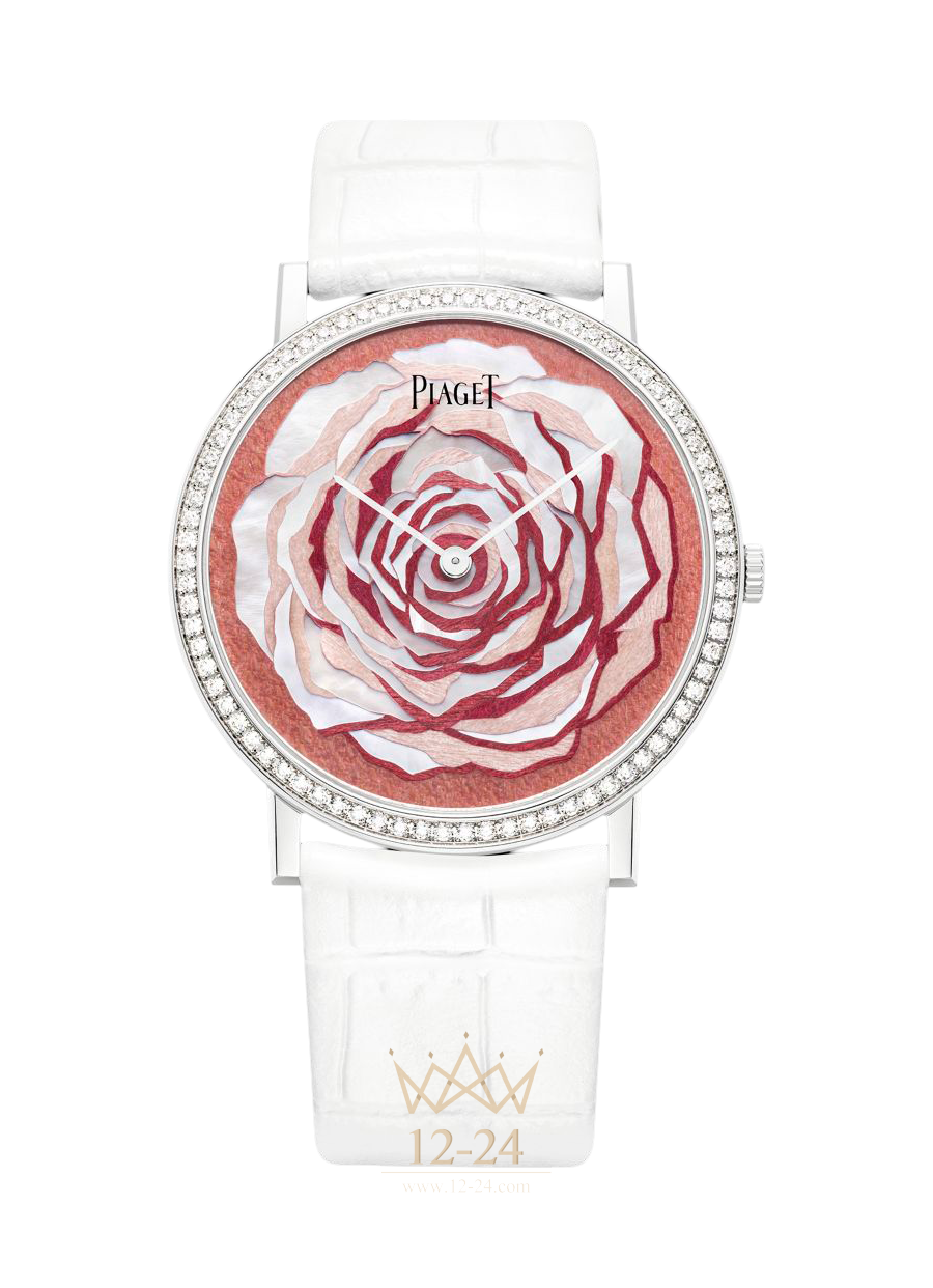Ультратонкие часы из белого золота, с бриллиантами. Циферблат с мозаикой-маркетри из дерева и перламутра. Ремешок из кожи аллигатора белого цвета. Благодаря сочетанию редких техник роскошные женские часы Altiplano объединяют легенду часового искусства и королеву цветов – розу, которая всегда восхищала мастеров Дома. Владение секретами изысканных художественно-прикладных ремесел позволило специалистам Piaget воссоздать великолепие розы Ив Пьяже, получившей первый приз на Международном конкурсе новых сортов роз в Женеве в 1982 году. Нежный цветок раскрывает 80 переливающихся лепестков на циферблате с мозаикой-маркетри из дерева и перламутра, продолжая великую традицию творческого созидания швейцарской Мануфактуры. В инкрустированный 78 бриллиантами корпус модели из белого золота диаметром 38 мм установлен ультратонкий мануфактурный механизм Piaget 430P с ручным заводом и толщиной всего 2,1 мм. Это миниатюрное произведение часового искусства выпущено серией из 18 экземпляров.