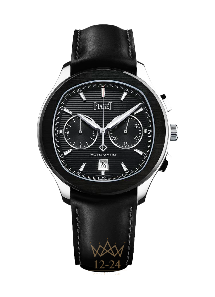 Мужские часы с хронографом, из стали. Безель с черным ADLC-покрытием. Черный циферблат с гильошированным узором. Черный ремешок из каучука. Часы из стали с хронографом, отличающиеся непринужденной элегантностью и современным дизайном, станут прекрасным аксессуаром для любого случая. Корпус диаметром 42 мм в форме «подушка» сохранил узнаваемые черты Piaget и прекрасно сочетается с безелем с черным ADLC-покрытием. Водонепроницаемость часов до 100 метров. Черный циферблат с горизонтальным гильошированным узором дополнен люминесцентными накладными часовыми индексами, стрелками в стиле «дофин» и секундной стрелкой хронографа с наконечником красного цвета. Модель с оснащена основными функциями: центральные часовая, минутная и секундная стрелки, хронограф и указатель даты в положении «6 часов». Через сапфировое стекло задней крышки корпуса открывается вид на мануфактурный механизм 1160P с автоподзаводом, а также ротор антрацитового цвета, украшенный гербом Piaget. Роскошные мужские часы, выпущенные ограниченной серией из 888 экземпляров, предлагаются с черным ремешком из каучука с прошивкой антрацитового цвета и стандартной застежкой. К модели прилагается второй сменный ремешок из телячьей кожи черного цвета.