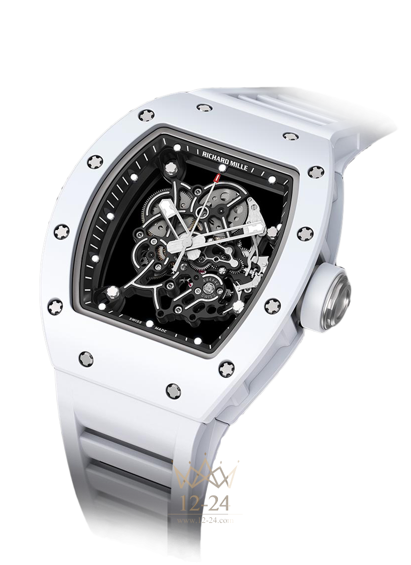 Опираясь на предыдущий опыт, специалисты Richard Mille выбрали для изготовления платины и мостов скелетонизированного механизма этой модели титан степени 5, который обладает высокой стойкостью к перегрузкам, способствуя этим точности и надежности часового механизма. Обрезиненная средняя часть корпуса и задняя крышка изготовлены из титана степени 5, а передний безель – из керамики ATZ.
