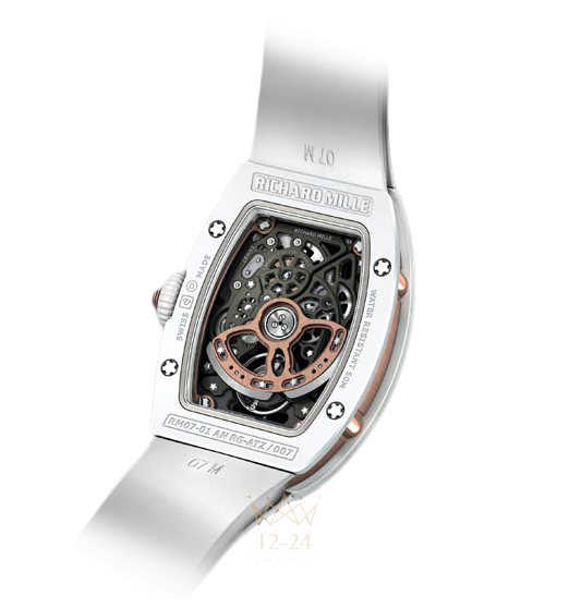 Механическое «сердце» новой модели — скелетонизированный калибр CRMA2 с автоматическим подзаводом, разработанный Richard Mille специально для часов RM 07-01. Белая платина и мосты изготовлены из титана степени 5. Кроме того, CRMA2 имеет баланс с переменной инерцией, обеспечивающий высокую точность хода в долгосрочной перспективе, и ротор из розового золота 5N 18 K с изменяемой геометрией, который может адаптироваться к образу жизни владельца часов.