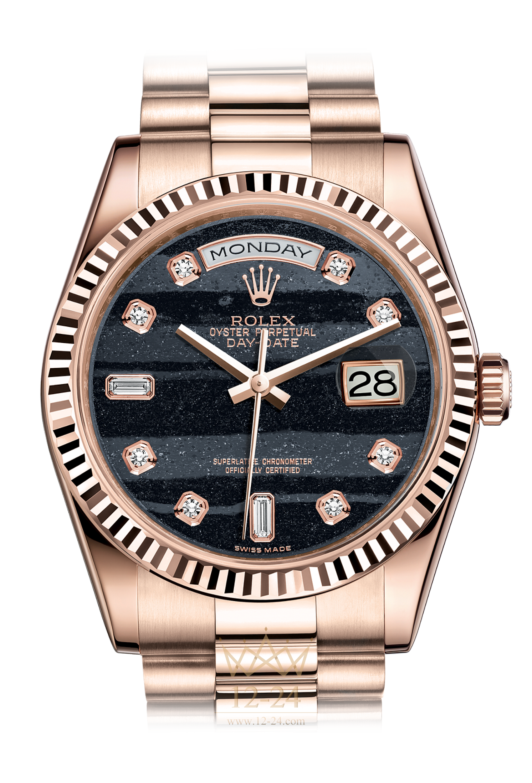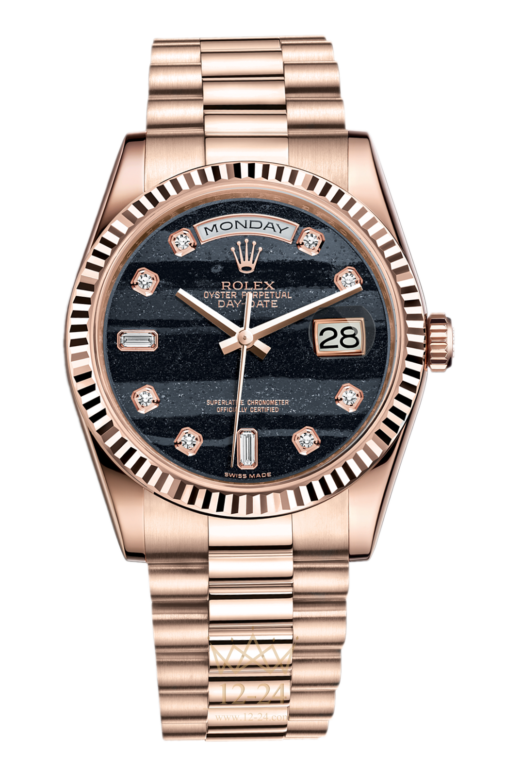 • Циферблат Бриллианты в оправе из 18-каратного золота и бриллианты багетной огранки в положении «6 часов» и «9 часов»