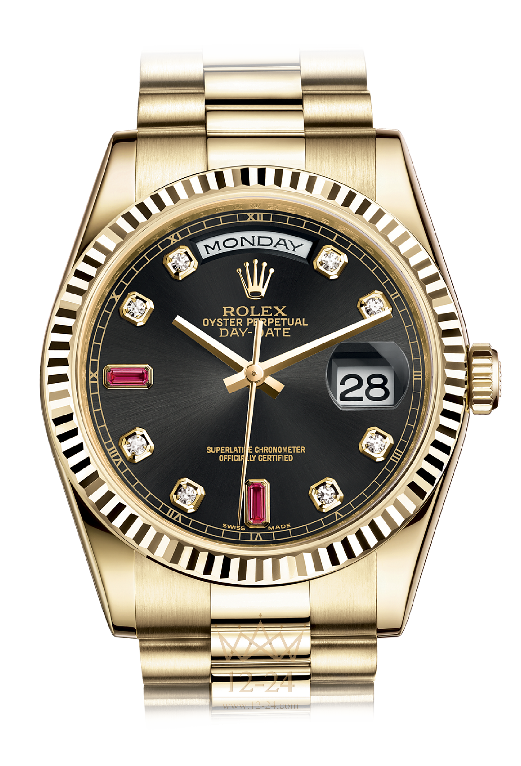 • Циферблат Бриллианты в оправе из 18-каратного золота и рубины багетной огранки в положении «6 часов» и «9 часов»
