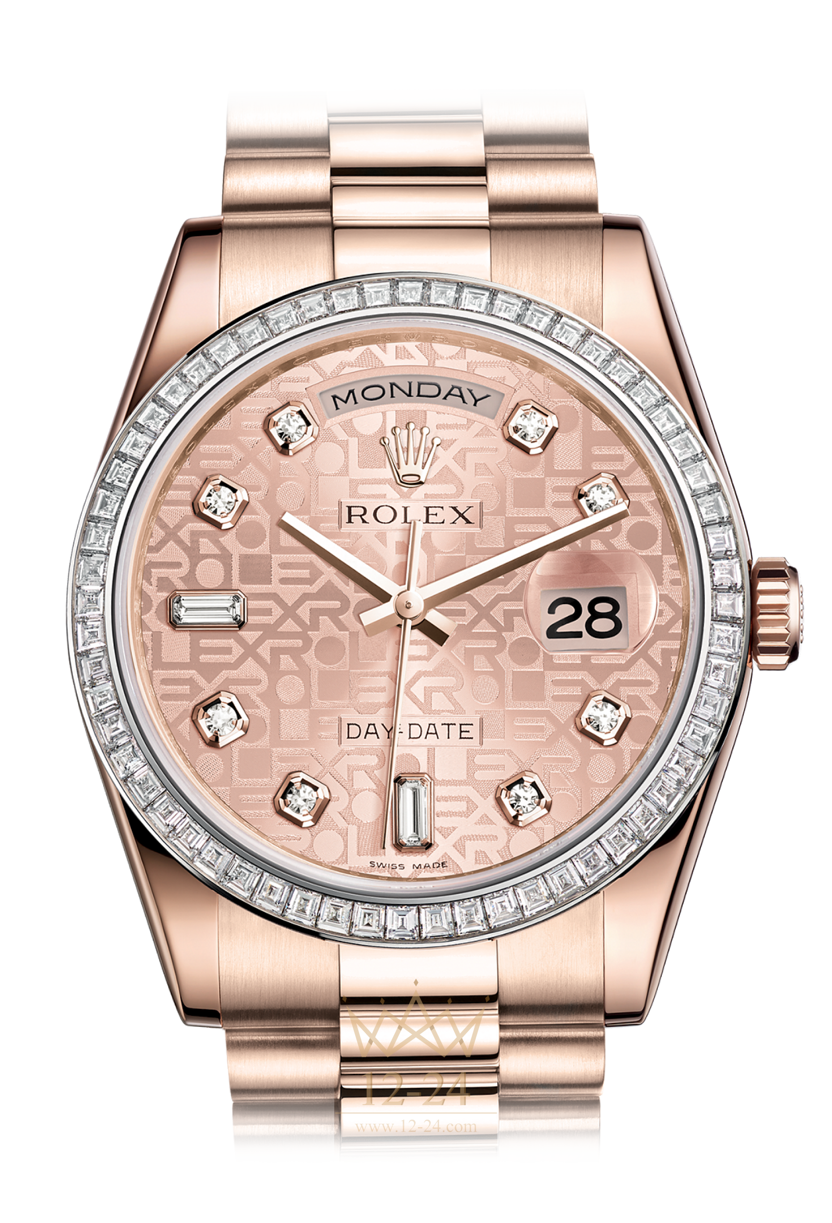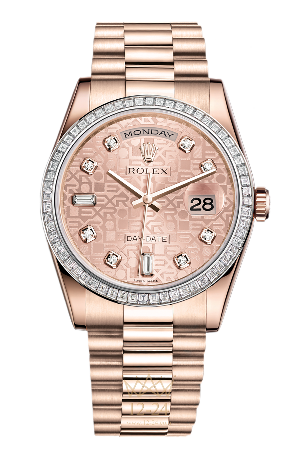 • Циферблат Бриллианты в оправе из 18-каратного золота и бриллианты багетной огранки в положении «6 часов» и «9 часов»