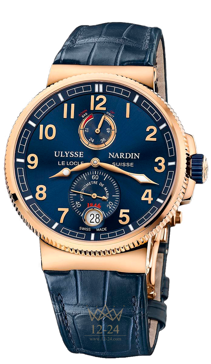 НАРУЧНЫЕ ЧАСЫ Marine Chronometer Manufacture диаметр 43мм Калибр UN-118 Автоподзавод малые секундные стрелки и индикатор запаса хода Корпус из 18-каратного розового золота водонепроницаемость 100 метров Голубой циферблат Ремешок из кожи аллигатора