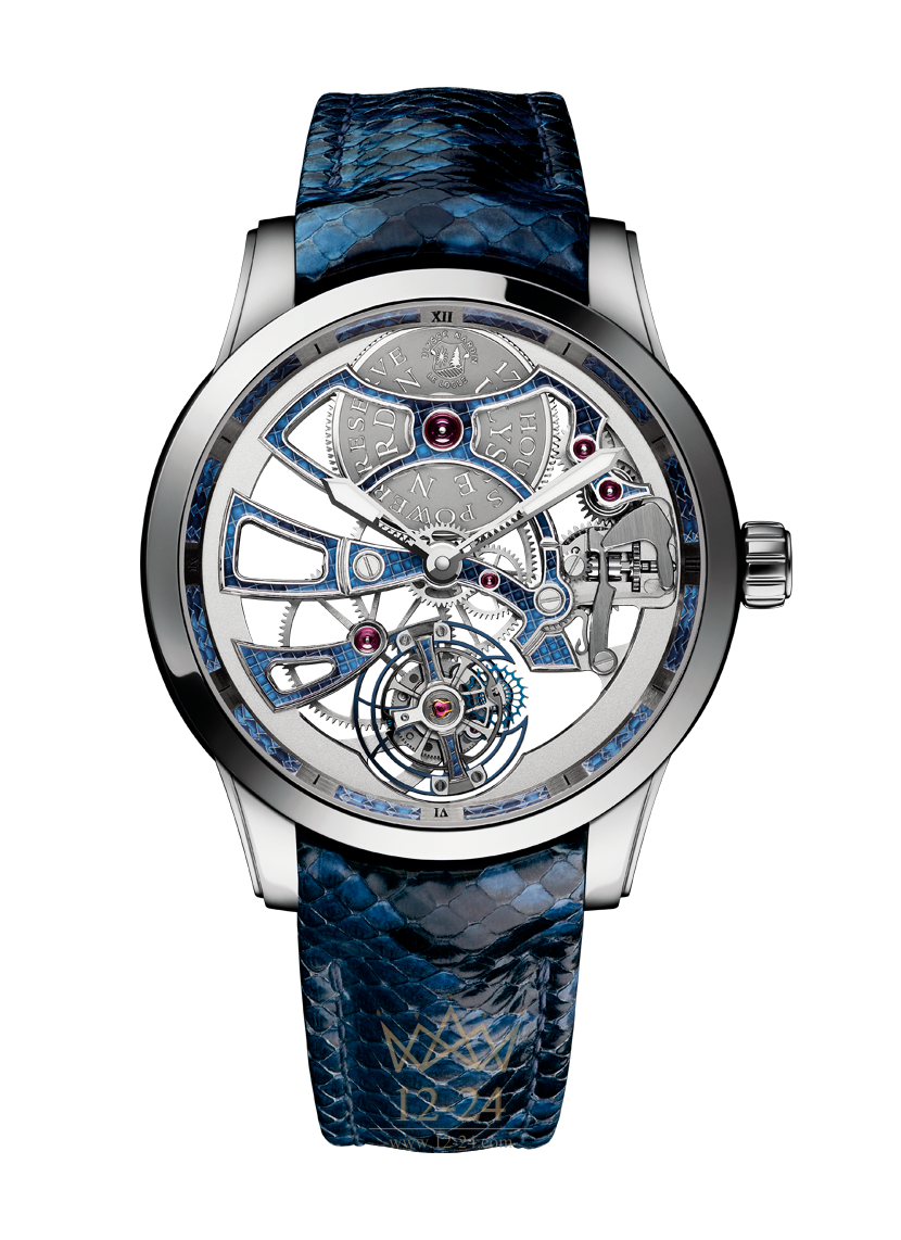Лимитированная коллекция 200 экземпляров. Калибр UN-170. Ручной завод. Корпус из 18-каратного белого золота диаметром 44мм, водонепроницаемость 30 метров. Ремешок из кожи аллигатора.
