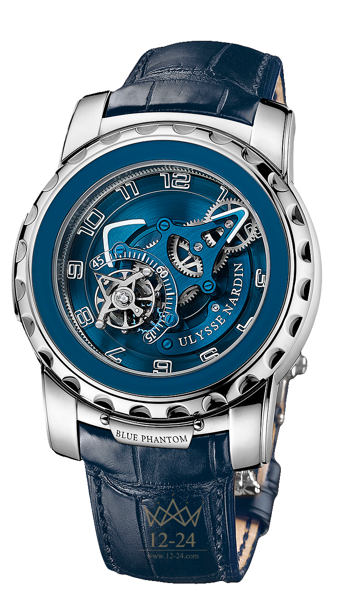 Ulysse Nardin представляет новую версию знаменитой модели Freak Phantom в благородном синем цвете! Новые часы с карусельным турбийоном выполнены из белого золота и снабжены синим внутренним фланцем, синим циферблатом и темно-синим ремешком из кожи аллигатора.