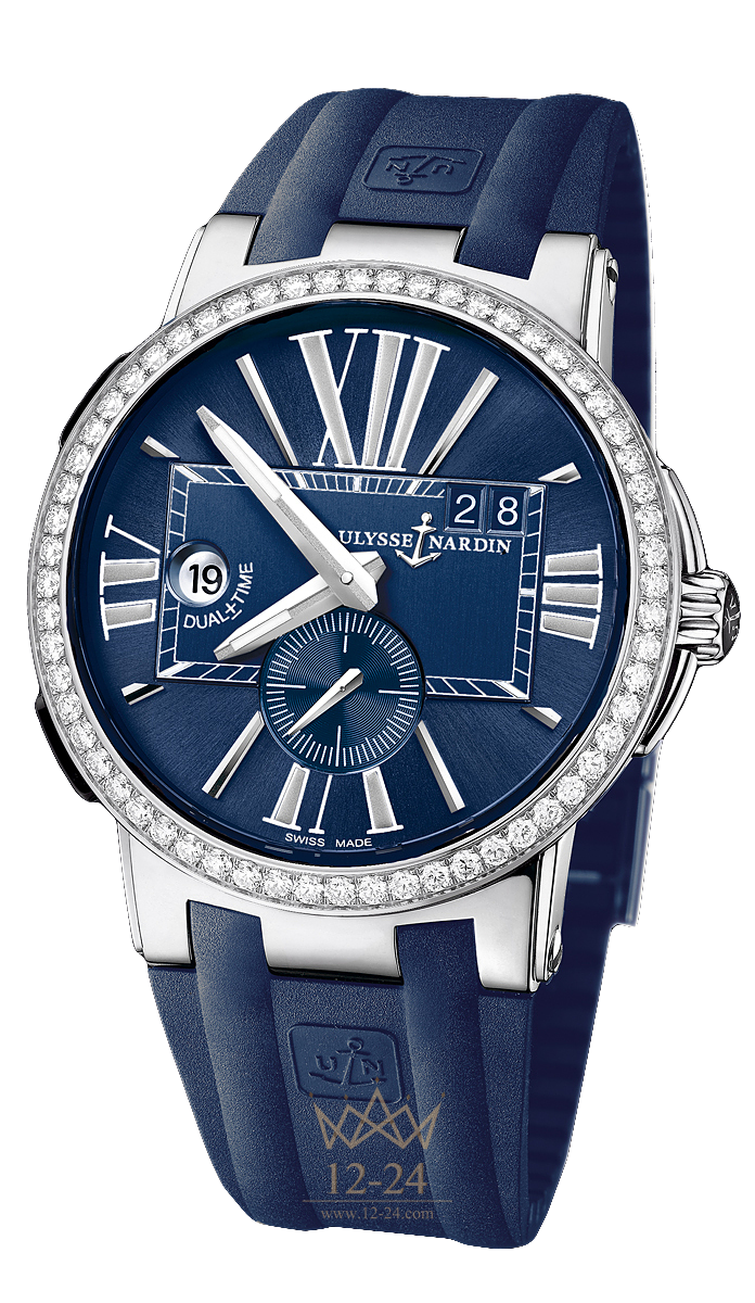 Калибр 11½" UN-24. Автоподзавод, быстрая настройка второго часового пояса, малая секундная стрелка. Корпус из нержавеющей стали диаметром 43мм, инкрустированный 60 бриллиантами, водонепроницаемость 100 метров. Голубой циферблат, римские цифры. Каучуковый ремешок или керамический браслет.