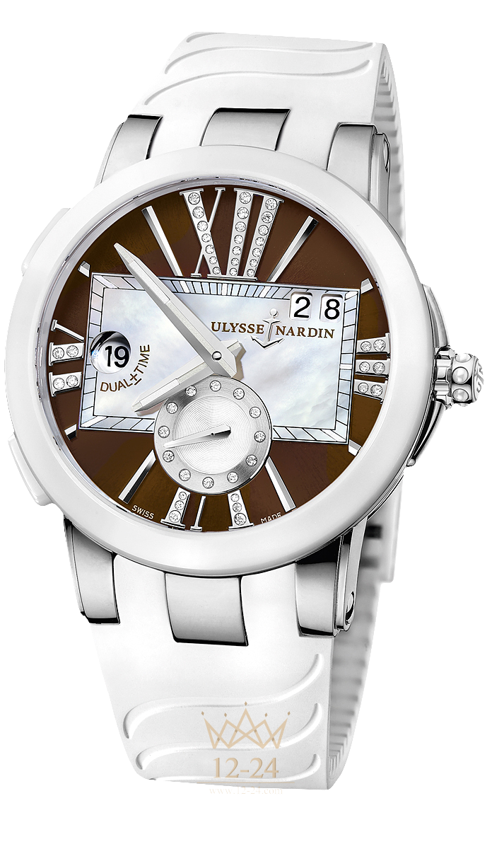 Калибр 11½" UN-24. Автоподзавод, быстрая настройка второго часового пояса, малая секундная стрелка. Корпус из нержавеющей стали диаметром 40мм, водонепроницаемость 50 метров. Белый перламутровый центр циферблата, коричневое внешнее кольцо, римские цифры, с 43 бриллиантами. Каучуковый ремешок или керамический браслет.