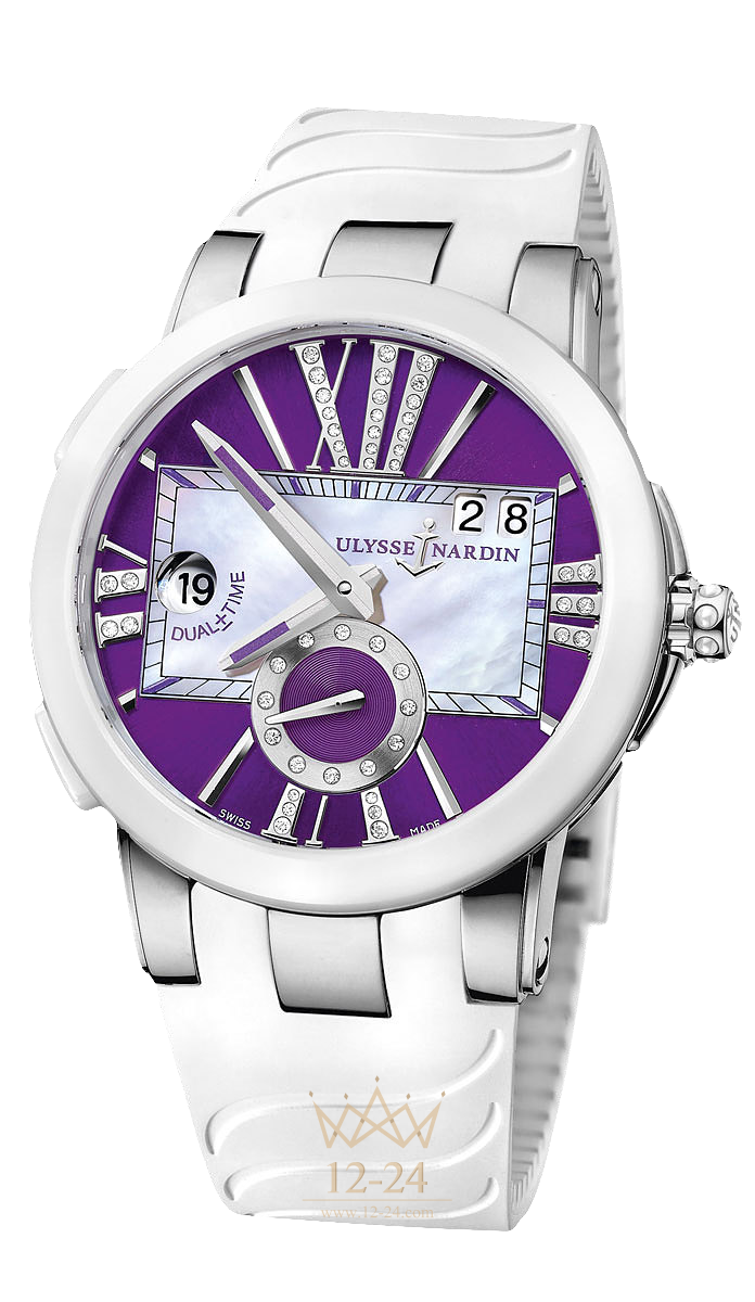 Калибр 11½" UN-24. Автоподзавод, быстрая настройка второго часового пояса, малая секундная стрелка. Корпус из нержавеющей стали диаметром 40мм ,водонепроницаемость 50 метров. Белый/фиолетовый циферблат, римские цифры, декорированные бриллиантами, 49 бриллиантов. Каучуковый ремешок или керамический браслет.