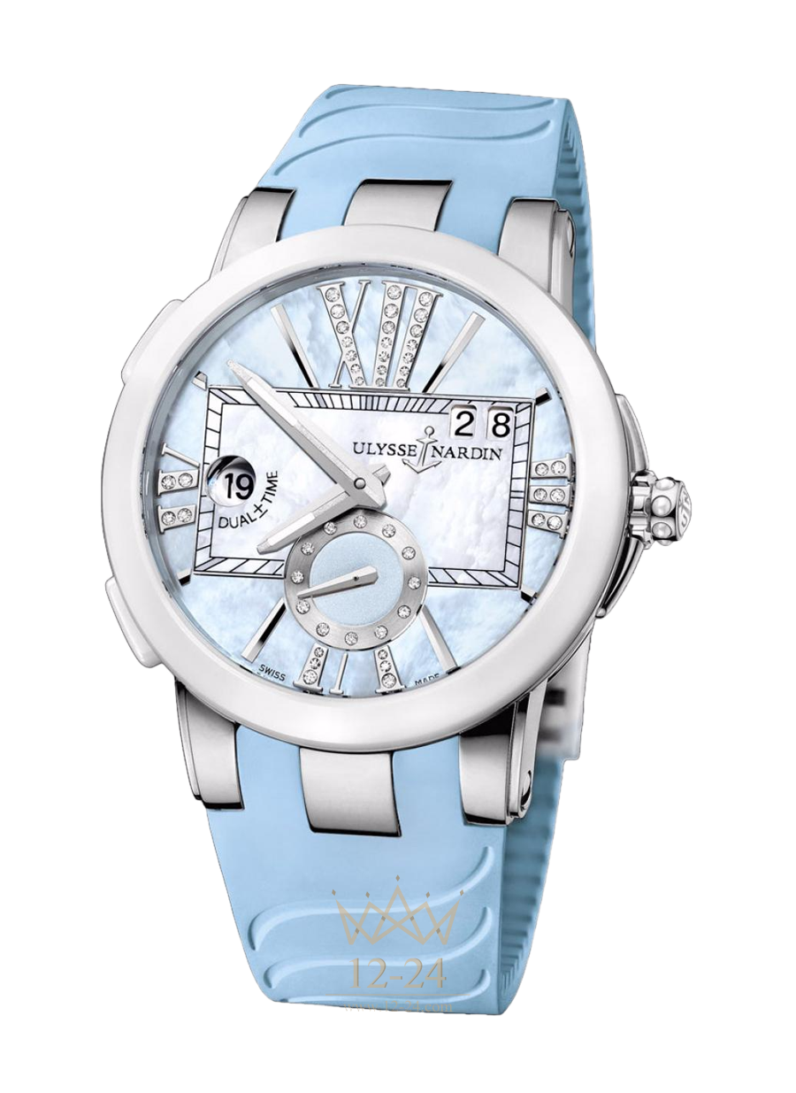 Калибр 11½" UN-24. Автоподзавод, быстрая настройка второго часового пояса, малая секундная стрелка. Корпус из нержавеющей стали диаметром 40мм, водонепроницаемость 50 метров. Голубой перламутровый циферблат, римские цифры, с 43 бриллиантами. Каучуковый ремешок или керамический браслет.